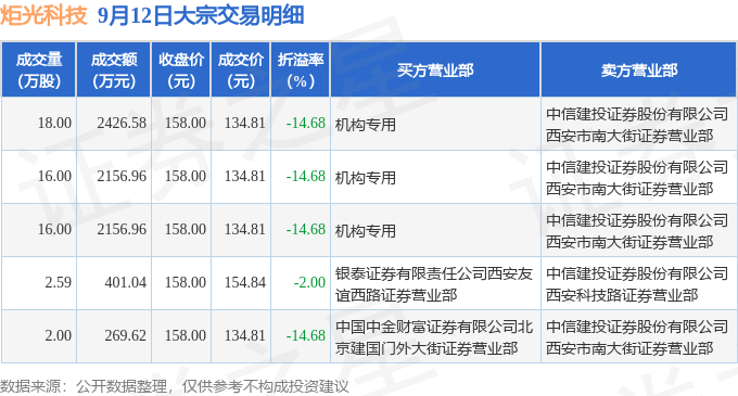 证券之星消息,9月12日炬光科技发生大宗交易,交易数据如下: