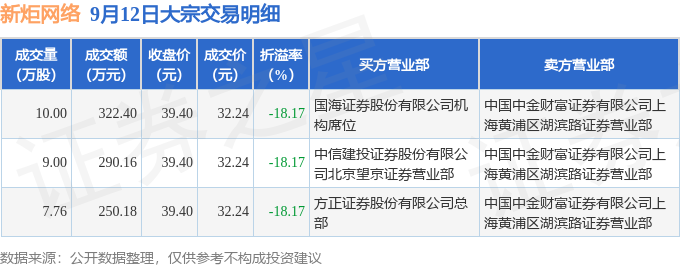 证券之星消息,9月12日新炬网络发生大宗交易,交易数据如下: