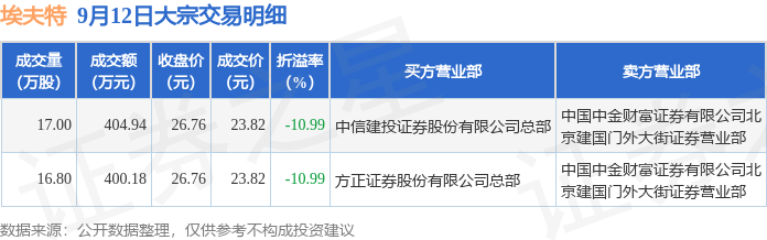 证券之星消息,9月12日埃夫特发生大宗交易,交易数据如下: