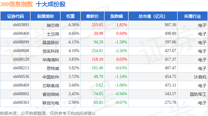 证券之星消息,9月12日,380信息(000111)指数报收于9493.42点,涨0.17%,成交408.28亿元,换手率2.78%。当日该指数成份股中,上涨的有21家,景旺电子以10.0%的涨幅领涨,下跌的有25家,环旭电子以2.87%的跌幅领跌。