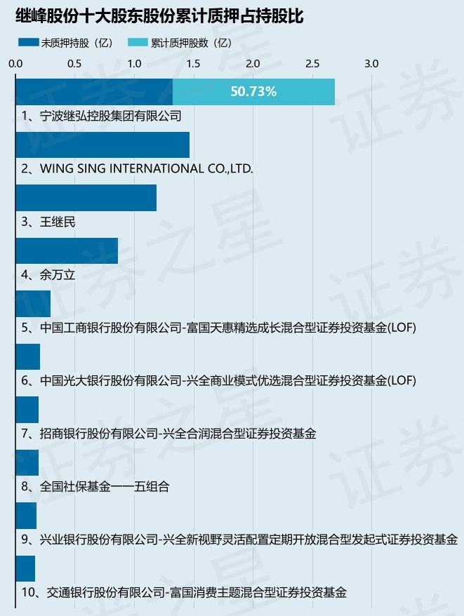 截止本公告日,股东宁波继弘控股集团有限公司已累计质押股份1.37亿股,占其持股总数的50.73%。本次质押后继峰股份十大股东的累计质押股份占持股比例(占持股比例的计算以公司最新一期财务报表公布的十大股东的持股总数为基准)见下图: