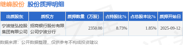 证券之星消息,继峰股份(603997)9月12日公开信息显示,股东宁波继弘控股集团有限公司向招商银行股份有限公司宁波分行合计质押2350.0万股,占总股本1.85%。质押详情见下表: