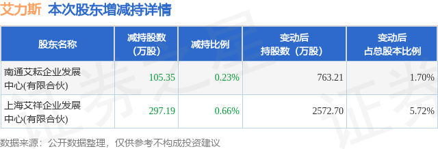 证券之星消息,9月12日艾力斯发布公告《艾力斯:上海艾力斯医药科技股份有限公司关于股东权益变动触及1%刻度的提示性公告》,其股东南通艾耘企业发展中心(有限合伙)、上海艾祥企业发展中心(有限合伙)于2025年9月2日至2025年9月12日间合计减持402.54万股,占公司目前总股本的0.8945%,变动期间该股股价下跌2.74%,截止9月12日收盘报113.78元。