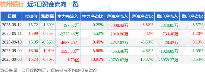 证券之星消息,截至2025年9月12日收盘,杭州银行(600926)报收于15.79元,下跌1.25%,换手率0.37%,成交量27.18万手,成交额4.32亿元。