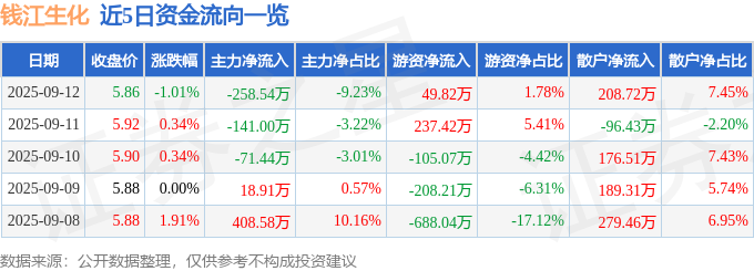 证券之星消息,截至2025年9月12日收盘,钱江生化(600796)报收于5.87元,下跌0.84%,换手率1.02%,成交量3.19万手,成交额1875.02万元。