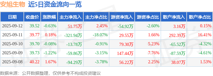 证券之星消息,截至2025年9月12日收盘,安旭生物(688075)报收于39.99元,上涨0.55%,换手率0.25%,成交量3160.0手,成交额1256.68万元。