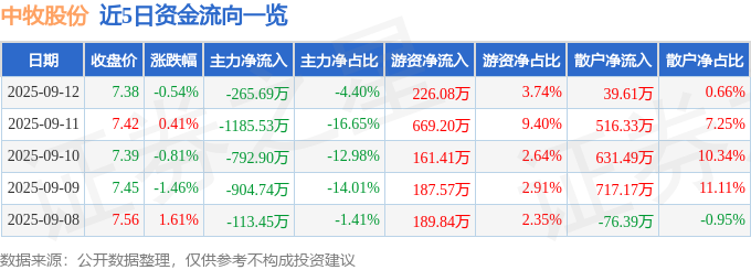 证券之星消息,截至2025年9月12日收盘,中牧股份(600195)报收于7.41元,下跌0.13%,换手率0.56%,成交量5.76万手,成交额4262.07万元。
