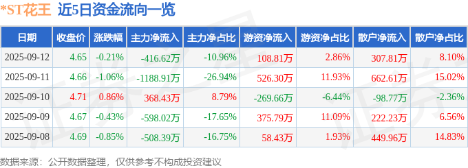 证券之星消息,截至2025年9月12日收盘,*ST花王(603007)报收于4.65元,下跌0.21%,换手率1.25%,成交量6.27万手,成交额2913.44万元。