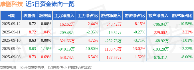 证券之星消息,截至2025年9月12日收盘,康鹏科技(688602)报收于8.75元,上涨0.34%,换手率1.87%,成交量4.85万手,成交额4216.2万元。