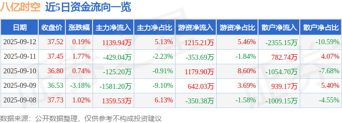 9月12日的资金流向数据方面,主力资金净流入1139.94万元,占总成交额5.13%,游资资金净流入1215.21万元,占总成交额5.46%,散户资金净流出2355.15万元,占总成交额10.59%。