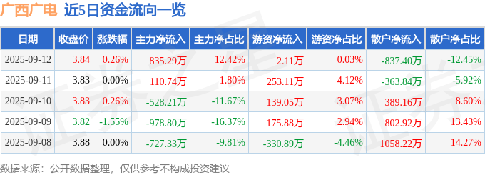 证券之星消息,截至2025年9月12日收盘,广西广电(600936)报收于3.84元,上涨0.26%,换手率0.77%,成交量12.92万手,成交额4957.11万元。