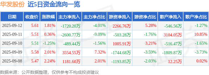 证券之星消息,截至2025年9月12日收盘,华发股份(600325)报收于5.6元,上涨1.63%,换手率2.13%,成交量58.65万手,成交额3.26亿元。