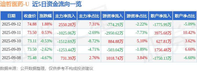 证券之星消息,截至2025年9月12日收盘,迪哲医药(688192)报收于73.51元,上涨0.01%,换手率0.62%,成交量2.53万手,成交额1.86亿元。