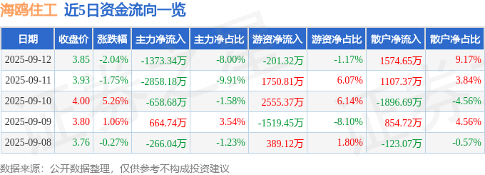 证券之星消息,截至2025年9月12日收盘,海鸥住工(002084)报收于3.88元,下跌1.27%,换手率4.78%,成交量30.79万手,成交额1.2亿元。