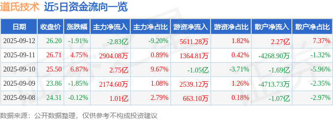 证券之星消息,截至2025年9月12日收盘,道氏技术(300409)报收于26.71元,上涨0.0%,换手率13.96%,成交量96.0万手,成交额25.73亿元。