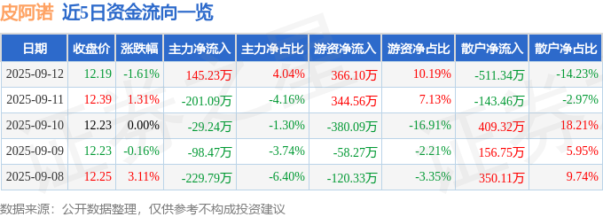 9月12日的资金流向数据方面,主力资金净流入145.23万元,占总成交额4.04%,游资资金净流入366.1万元,占总成交额10.19%,散户资金净流出511.34万元,占总成交额14.23%。
