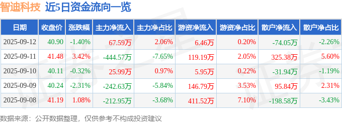 证券之星消息,截至2025年9月12日收盘,智迪科技(301503)报收于41.29元,下跌0.46%,换手率1.73%,成交量5633.0手,成交额2317.29万元。
