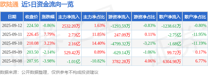证券之星消息,截至2025年9月12日收盘,欧陆通(300870)报收于225.8元,下跌0.29%,换手率5.23%,成交量5.73万手,成交额13.05亿元。