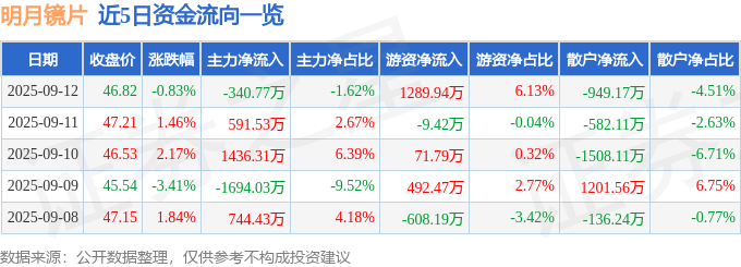 证券之星消息,截至2025年9月12日收盘,明月镜片(301101)报收于47.01元,下跌0.42%,换手率1.74%,成交量3.32万手,成交额1.57亿元。