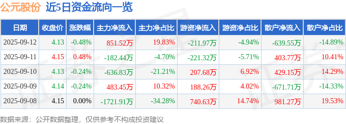 证券之星消息,截至2025年9月12日收盘,公元股份(002641)报收于4.15元,上涨0.0%,换手率0.62%,成交量7.05万手,成交额2920.0万元。