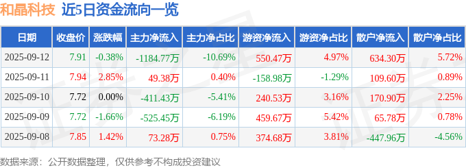 9月12日的资金流向数据方面,主力资金净流出1184.77万元,占总成交额10.69%,游资资金净流入550.47万元,占总成交额4.97%,散户资金净流入634.3万元,占总成交额5.72%。