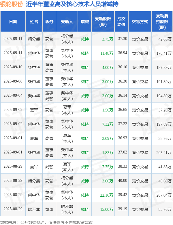 银轮股份近半年内的董监高及核心技术人员增减持详情如下: