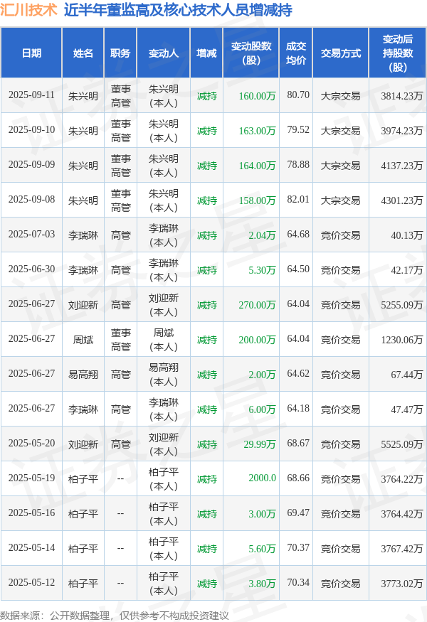 汇川技术近半年内的董监高及核心技术人员增减持详情如下: