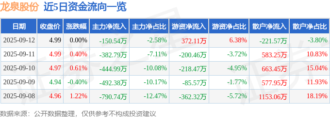 证券之星消息,截至2025年9月12日收盘,龙泉股份(002671)报收于5.02元,上涨0.6%,换手率1.67%,成交量9.17万手,成交额4584.06万元。