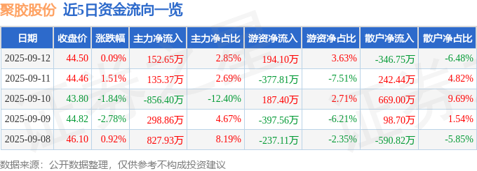 证券之星消息,截至2025年9月12日收盘,聚胶股份(301283)报收于44.9元,上涨0.99%,换手率1.89%,成交量8679.0手,成交额3875.26万元。