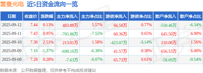 证券之星消息,截至2025年9月12日收盘,雷曼光电(300162)报收于7.51元,上涨1.08%,换手率2.66%,成交量9.1万手,成交额6815.31万元。