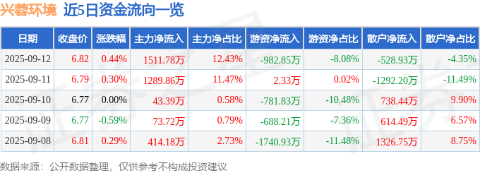 证券之星消息,截至2025年9月12日收盘,兴蓉环境(000598)报收于6.78元,下跌0.15%,换手率0.27%,成交量8.08万手,成交额5488.26万元。