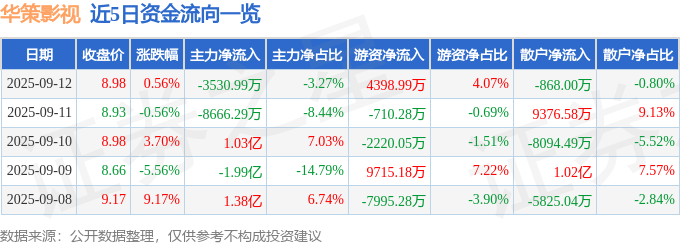 证券之星消息,截至2025年9月12日收盘,华策影视(300133)报收于8.95元,上涨0.22%,换手率5.32%,成交量86.43万手,成交额7.78亿元。