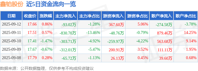 证券之星消息,截至2025年9月12日收盘,鑫铂股份(003038)报收于17.71元,上涨1.14%,换手率1.74%,成交量2.88万手,成交额5092.75万元。