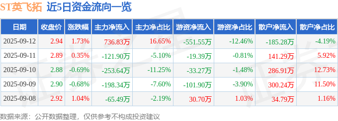 9月12日的资金流向数据方面,主力资金净流入736.83万元,占总成交额16.65%,游资资金净流出551.55万元,占总成交额12.46%,散户资金净流出185.28万元,占总成交额4.19%。