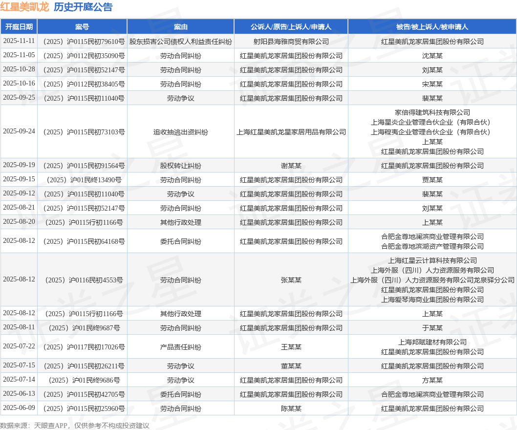 案号:(2025)沪01民终13490号根据统计,近一年内以红星美凯龙家居集团股份有限公司为当事人的历史开庭公告有74则,其中案由为“劳动合同纠纷”的公告以21则居首,其次为“劳动争议”有10则,“租赁合同纠纷”有7则。历史开庭公告(前20条)如下: