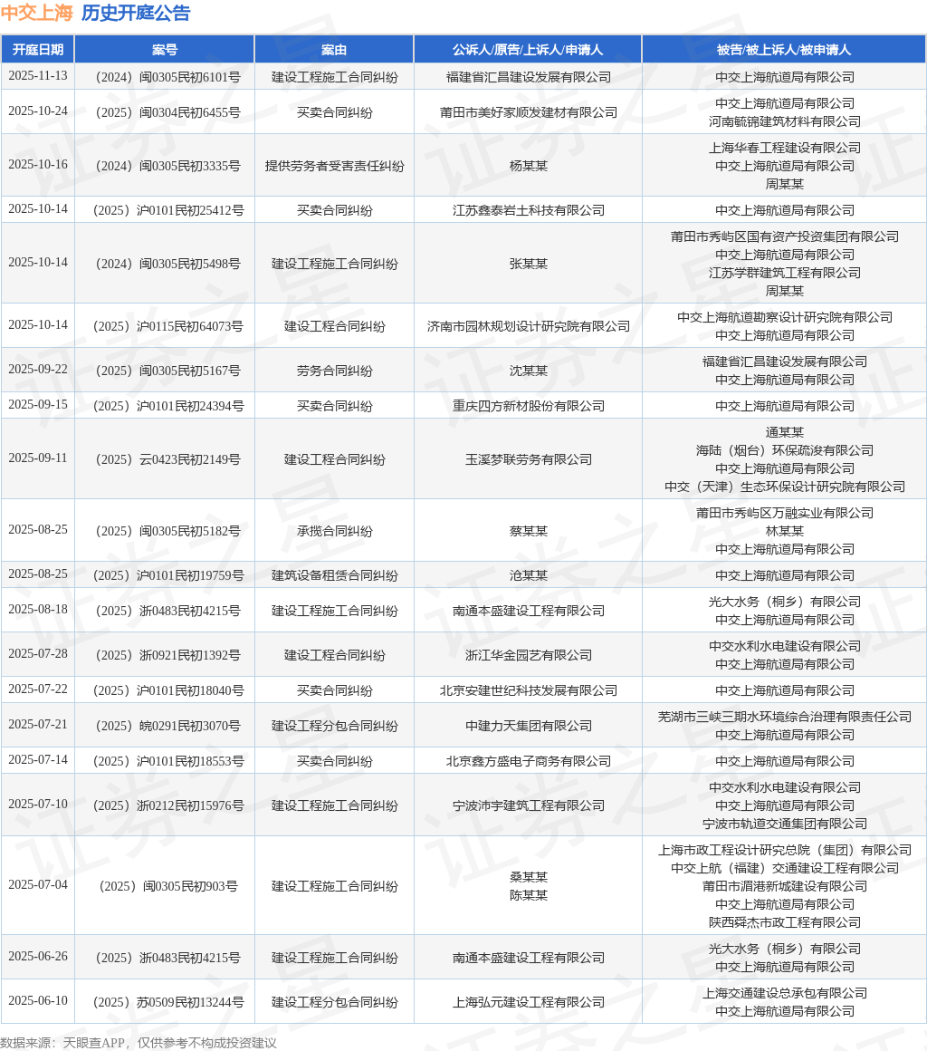 案号:(2025)沪0101民初24394号根据统计,近一年内以中交上海航道局有限公司为当事人的历史开庭公告有84则,其中案由为“建设工程施工合同纠纷”的公告以29则居首,其次为“建设工程分包合同纠纷”有14则,“买卖合同纠纷”有11则。历史开庭公告(前20条)如下: