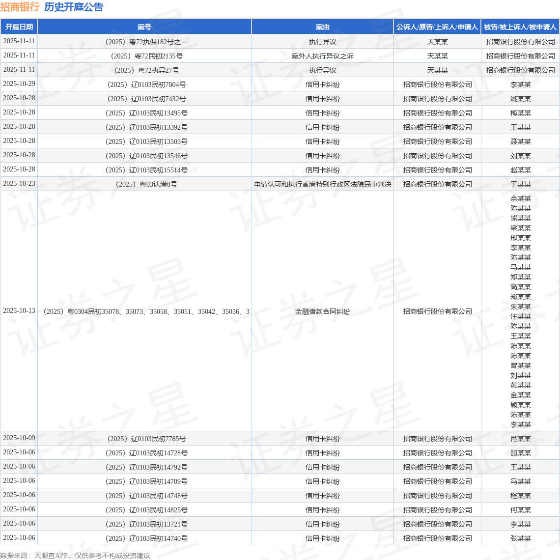 案号:(2025)黔0302民初13247号根据统计,近一年内以招商银行股份有限公司为当事人的历史开庭公告有956则,其中案由为“信用卡纠纷”的公告以461则居首,其次为“金融借款合同纠纷”有421则,“借款合同纠纷”有36则。历史开庭公告(前20条)如下:
