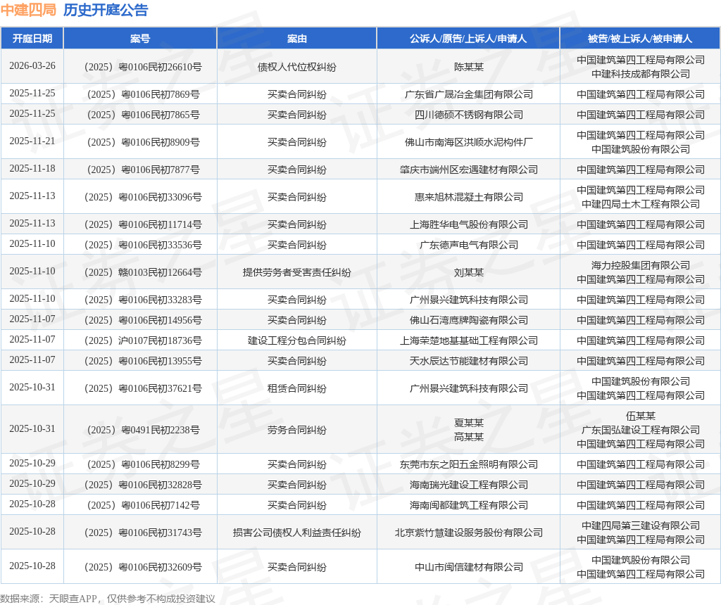 案号:(2025)浙0382民初11622号根据统计,近一年内以中国建筑第四工程局有限公司为当事人的历史开庭公告有1670则,其中案由为“买卖合同纠纷”的公告以676则居首,其次为“劳动争议”有185则,“建设工程施工合同纠纷”有179则。历史开庭公告(前20条)如下: