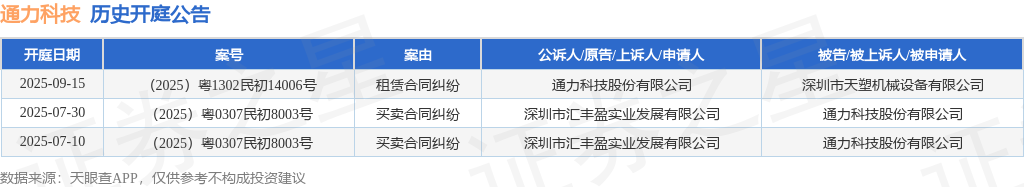 根据统计,近一年内以通力科技股份有限公司为当事人的历史开庭公告有3则,其中案由为“买卖合同纠纷”的公告以2则居首,其次为“租赁合同纠纷”有1则。历史开庭公告如下:
