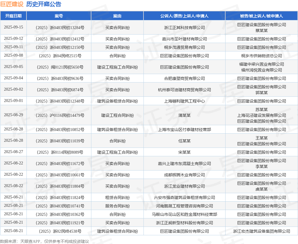 案号:(2025)浙0483民初13284号根据统计,近一年内以巨匠建设集团股份有限公司为当事人的历史开庭公告有253则,其中案由为“买卖合同纠纷”的公告以82则居首,其次为“合同纠纷”有42则,“建设工程施工合同纠纷”有37则。历史开庭公告(前20条)如下: