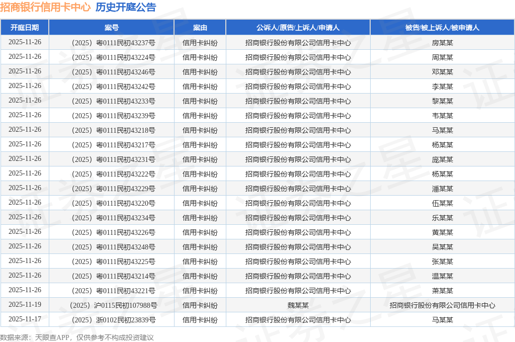 案号:(2025)沪0115民初82569号根据统计,近一年内以招商银行股份有限公司信用卡中心为当事人的历史开庭公告有13259则,其中案由为“信用卡纠纷”的公告以10729则居首,其次为“金融借款合同纠纷”有2328则,“合同纠纷”有85则。历史开庭公告(前20条)如下: