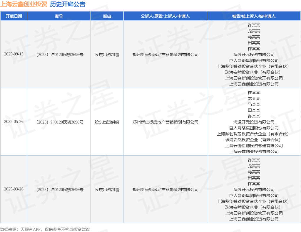 根据统计,近一年内以上海云鑫创业投资有限公司为当事人的历史开庭公告有3则,其中案由为“股东出资纠纷”的公告以3则居首。历史开庭公告如下: