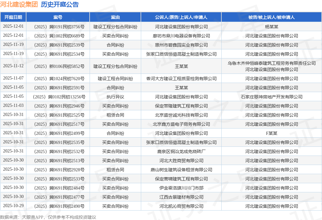 案号:(2025)冀0691民初1841号根据统计,近一年内以河北建设集团股份有限公司为当事人的历史开庭公告有1603则,其中案由为“买卖合同纠纷”的公告以644则居首,其次为“建设工程施工合同纠纷”有223则,“劳务合同纠纷”有127则。历史开庭公告(前20条)如下: