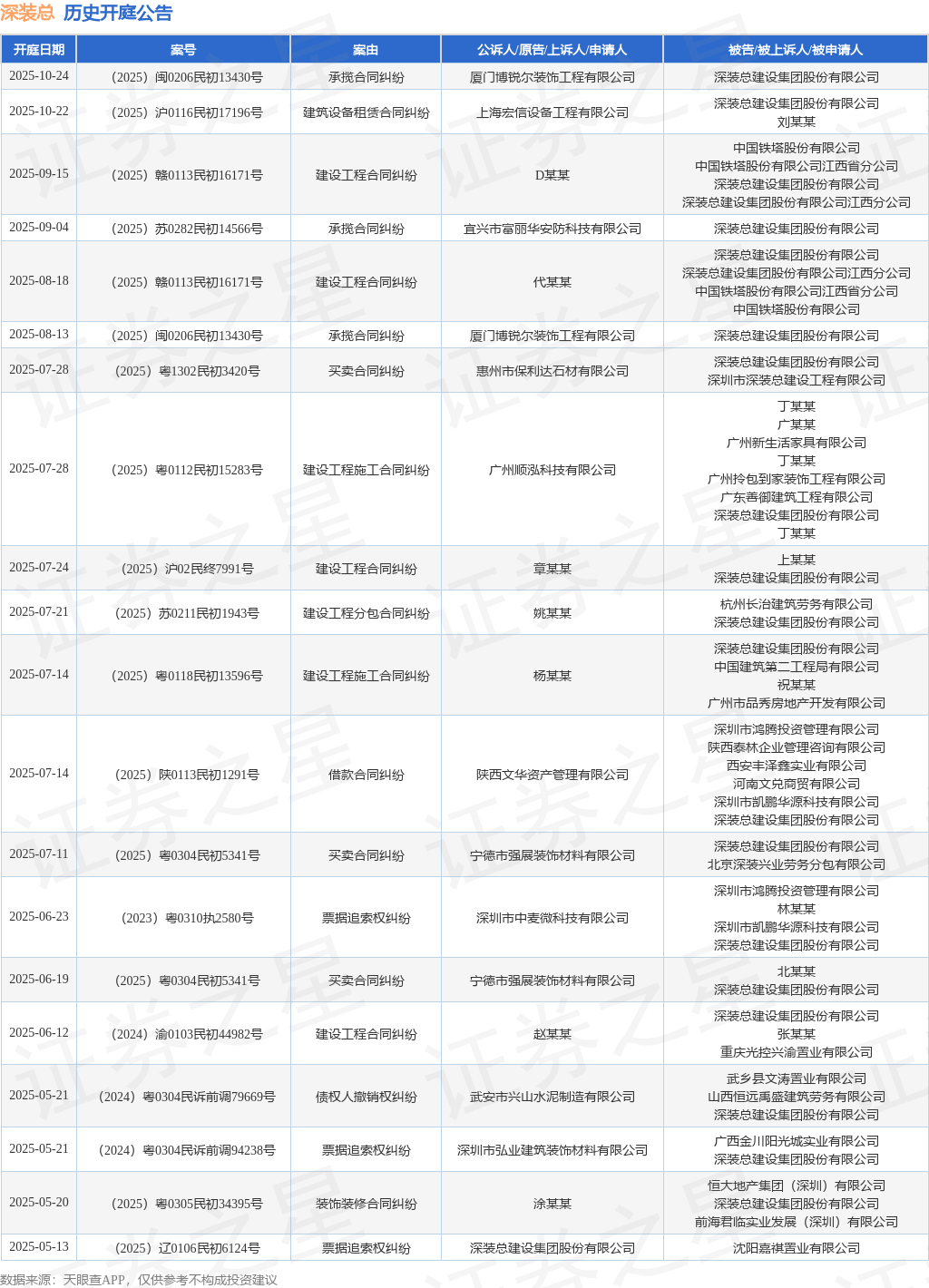 案号:(2025)赣0113民初16171号根据统计,近一年内以深装总建设集团股份有限公司为当事人的历史开庭公告有104则,其中案由为“建设工程分包合同纠纷”的公告以14则居首,其次为“建设工程合同纠纷”有13则,“建设工程施工合同纠纷”有13则。历史开庭公告(前20条)如下: