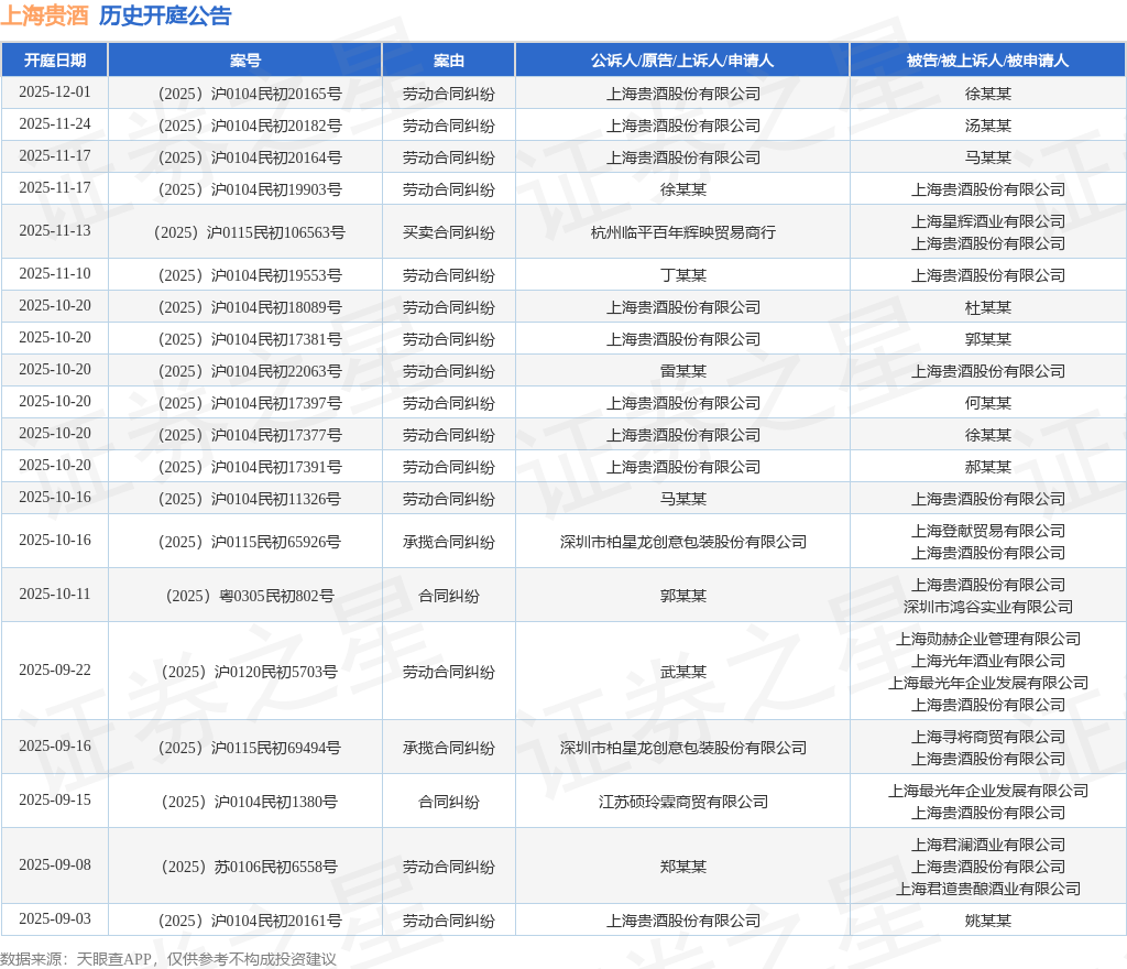 案号:(2025)沪0104民初1380号根据统计,近一年内以上海贵酒股份有限公司为当事人的历史开庭公告有102则,其中案由为“劳动合同纠纷”的公告以33则居首,其次为“合同纠纷”有15则,“承揽合同纠纷”有9则。历史开庭公告(前20条)如下: