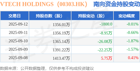证券之星消息,9月12日南向资金减持1800.0股VTECH HOLDINGS(00303.HK)。近5个交易日中,获南向资金减持的有4天,累计净减持51.71万股。近20个交易日中,获南向资金减持的有11天,累计净减持56.77万股。截至目前,南向资金持有VTECH HOLDINGS(00303.HK)1356.01万股,占公司已发行普通股的5.35%。