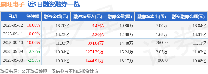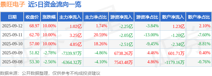 证券之星消息,截至2025年9月12日收盘,景旺电子(603228)报收于67.0元,上涨6.86%,已连续涨停3天,换手率7.61%,成交量71.02万手,成交额48.63亿元。