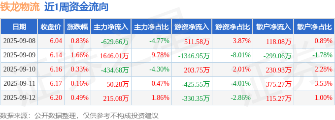 资金流向数据方面,本周铁龙物流主力资金合计净流入847.04万元,游资资金合计净流出1387.52万元,散户资金合计净流入540.49万元。本周资金流向一览见下表: