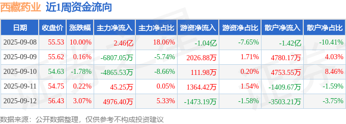 资金流向数据方面,本周西藏药业主力资金合计净流入1.8亿元,游资资金合计净流出8401.06万元,散户资金合计净流出9581.72万元。本周资金流向一览见下表: