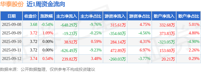 资金流向数据方面,本周华泰股份主力资金合计净流出1015.27万元,游资资金合计净流入458.01万元,散户资金合计净流入557.26万元。本周资金流向一览见下表: